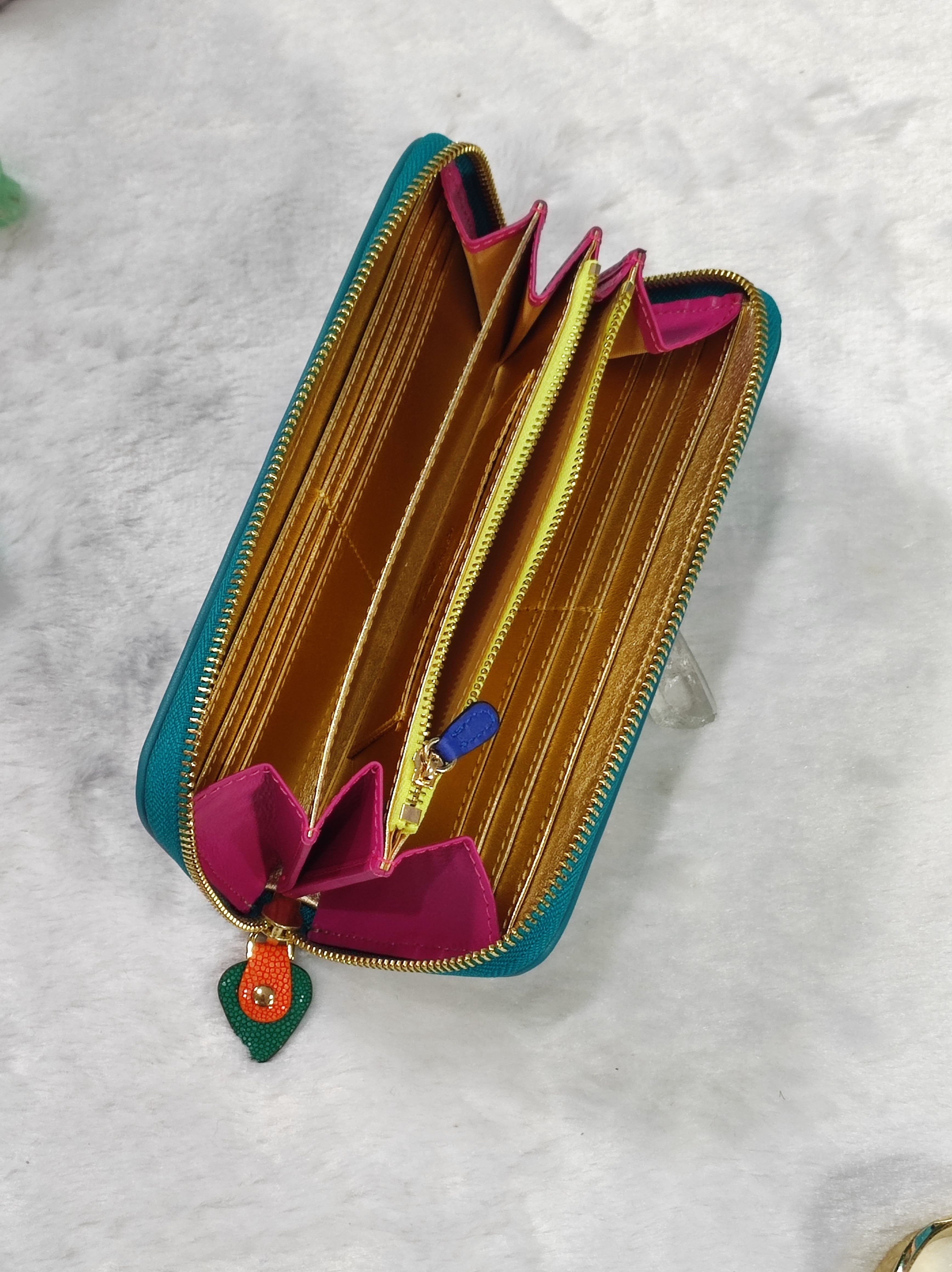深いグリーンの中に鮮やかな輝きをまとった、ユニークで印象的なお財布です。